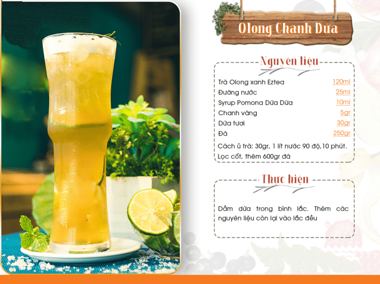 Trà Olong xanh Eztea: 120ml (30gr, 1 lít nước 90 độ,10 phút. Lọc cốt, thêm 600gr đá)
